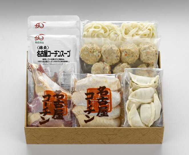 商品説明 名称 名古屋コーチン寄せ鍋セット 内容量 名古屋コーチン骨付ぶつ切200グラム 名古屋コーチン手羽先160グラム(4本) 名古屋コーチン五目天300グラム(10個) 名古屋コーチン水餃子140グラム(10個) きしめん200グラム 名古屋コーチンスープ200グラム×2 配送方法 冷凍 賞味期限 30日間 アレルギー 小麦、大豆、豚肉、鶏肉、さば、ごま 提供業者 (株)吉川産業 058−398−8230 説明 名古屋コーチンをいろどり豊かに詰め合わせ。